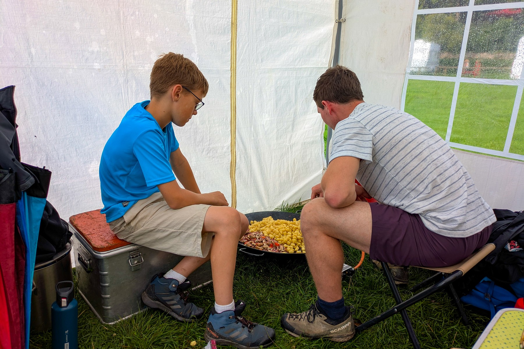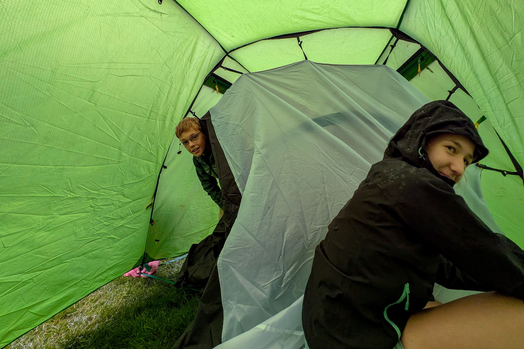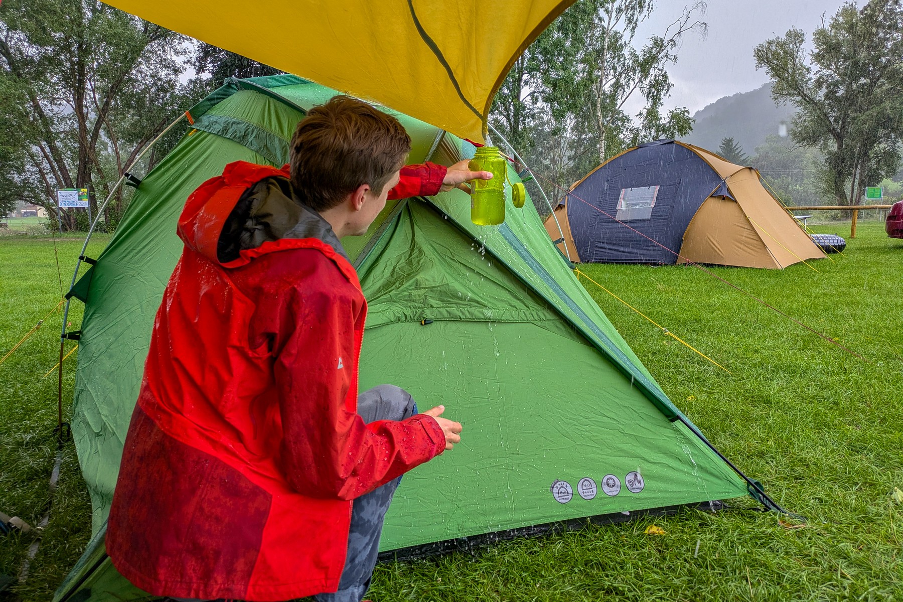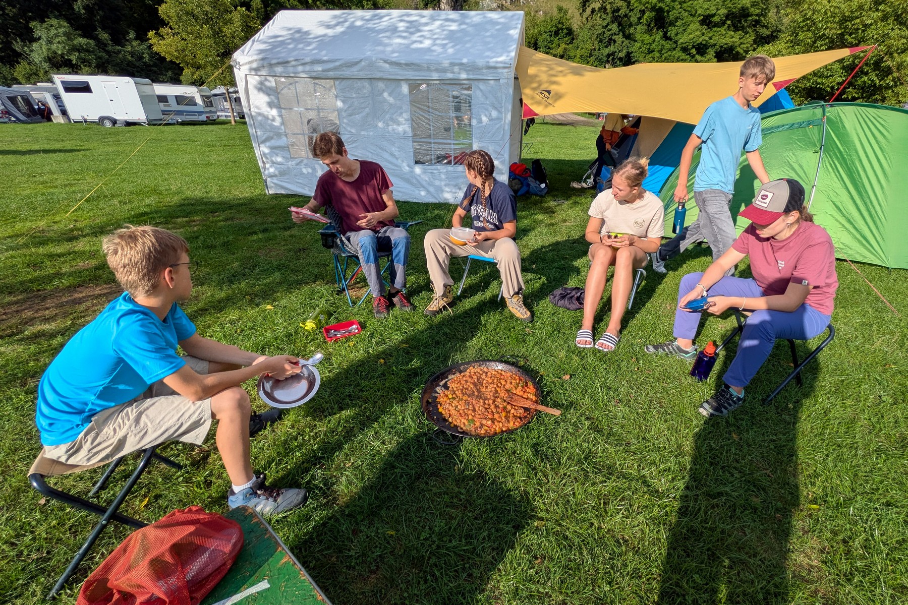 Während der Regen auf unser Zeltdach prasselte, erwachten wir langsam aus unserem Schönheitsschlaf. Nach einem gemütlichen Frühstück begaben wir uns auf eine schöne Panorama Wanderung mit 15 km ohne viel Panorama. Danach haben wir uns gestärkt um wieder in süße Träume zu verfallen. Nach einem ausgiebigen Mittagsschlaf war es plötzlich schon wieder an der Zeit für Abendessen zu sorgen. Kässpätzle essen kann ganz schön anstrengend sein, weshalb wir nach einer Runde Karaoke mit der Fortsetzung unserer Gute Nacht Geschichte wieder in tiefen Schlaf verfielen.Ausnahmsweise (meistens) Sonne statt Regen